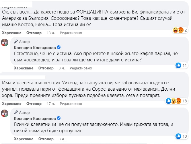 В мненията във Facebook Костадинов отхвърля това със закани към публицистите, само че към момента не е дал ясно пояснение за финансирането на фондацията.