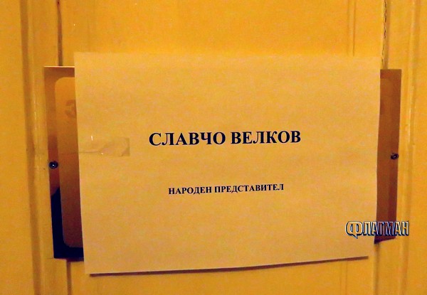 Любопитното е, че депутатът Славчо Велков е решил, че му се поставя да употребява канцеларията. Той даже е поставил върху лъскавата златиста табела с името на Жаблянов хартиена такава с надпис „ Славчо Велков – национален представител”.