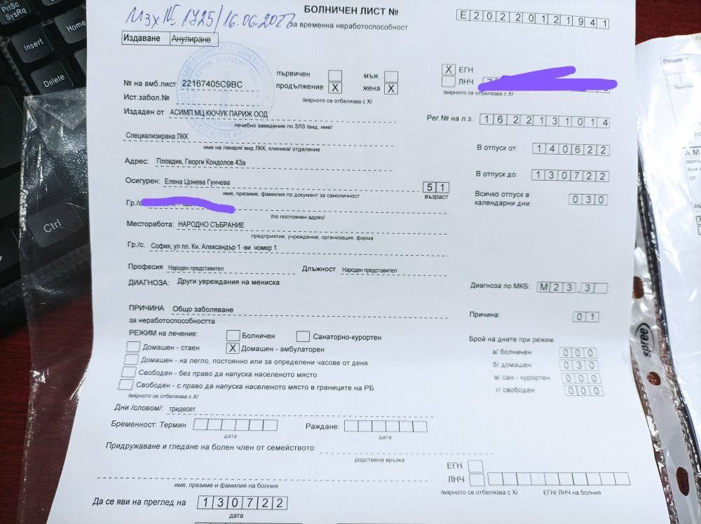 Оказа се, че Гунчева е в болничен. Тя разгласява в нета освен болничния си лист, само че и фотография на крайници ѝ на легло.