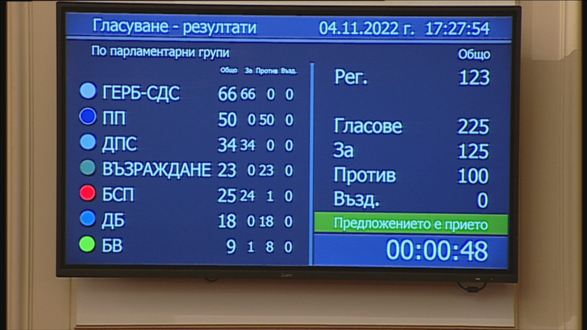 Предложението беше подкрепено със 125 гласа от ГЕРБ, Движение за права и свободи и Българска социалистическа партия и един народен представител от " Български напредък ", срещу гласоподаваха от Политическа партия, Демократична България, " Възраждане " и 8 души от " Български напредък ".