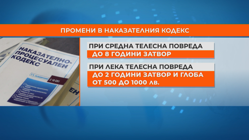 С измененията в Наказателния кодекс се предлага завишаване на глобите за причиняване на междинна и лека телесна щета. До 8 години затвор грозят всеки, който аргументи междинна телесна щета на различен човек. В момента наказването е до 6 години.