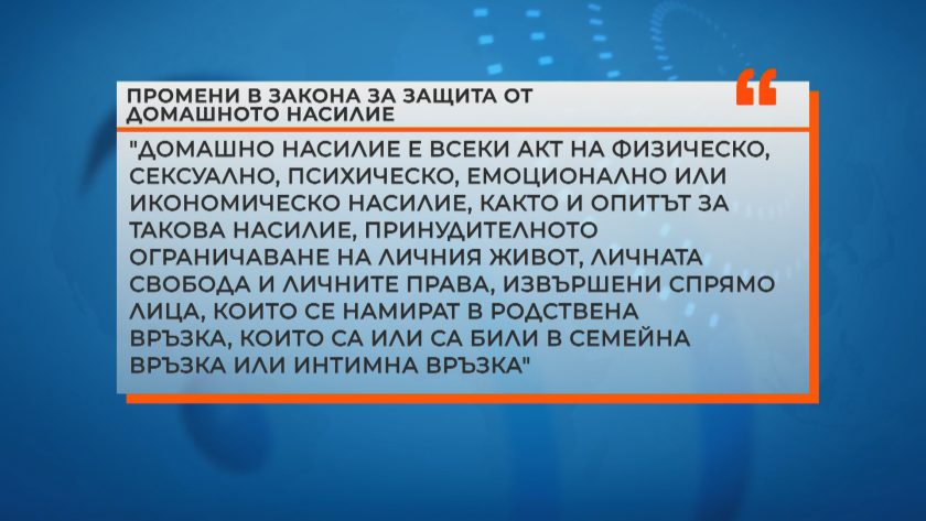 Също по този начин - насилственото ограничение на персоналния живот, персоналната независимост и персоналните права, осъществени по отношение на лица, които се намират в родствена връзка, които са или са били в фамилна или интимна връзка. Министърът на правораздаването Атанас Славов подсети, че в два следващи Народното събрание подобен текст е бил предвиждан, само че не е бил признат.