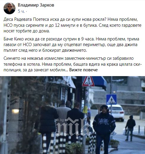 Баче Кико желае да се разноски заран в 9 часа. Няма проблем, трима гавази от НСО стартират да му отделят периметър, още два джипа пъплят след него и блокират придвижването. " Това написа в профила си във " Facebook " журналистът Владимир Зарков. Поводът е разкритието на ПИК, че Кирил Петков върви пешком от вкъщи си, само че придружаван от трима охранители и две коли на НСО.