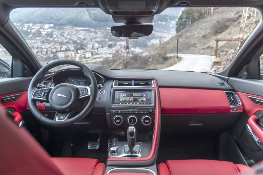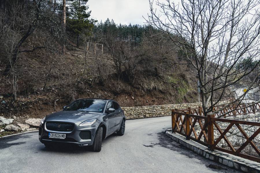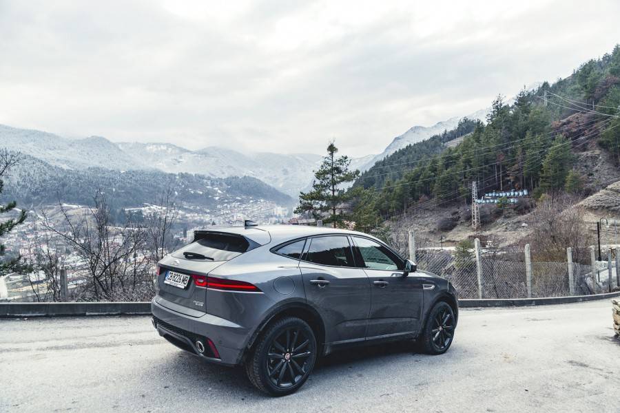 Потегляйки в града, първо изпробвах икономичния режим Eco. Дори и в него, колата реагира доста бодро на педала на газта. В режим Comfort разликите са незначителни, само че несъмнено E-Pace вози по-меко. Най-много ми хареса режима Dynamic, в който таблото става алено, 2,0-литровият турбодизелов мотор с мощ 180 к.с. работи при по-високи обороти, а педалът на газта е доста по-чувствителен. При гладко ускоряване 9-степенната автоматизирана скоростна кутия насилствено превключва нагоре, а при внезапно натискане на газта, смъква няколко предавки надолу. За още по-бързи реакции има пера от двете страни на кормилото за ръчна промяна на предавките. Дизеловият мотор има задоволително двигателна сила с цел да може E-Pace да спринтира пъргаво при старта от място, като в това време форсира динамично компактния SUV и при изпреварване. При умерено шофиране разходът в разбъркан цикъл е в границите на 7 литра на 100 км. Ако карате динамично, E-Pace може да харчи и над 10 л/100 км. Дори и при високи скорости, изолацията на шума е качествена и салона остава безшумно.