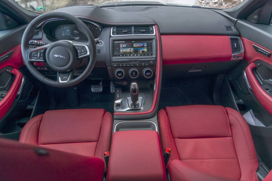 Кокпитът на Jaguar E-Pace наподобява повече на кабина на изтребител, в сравнение с салон на автомобил, като несъмнено има директна аналогия с другите модели на марката. Воланът е с дребен диаметър, обшит е с приятна за улавяне кожа, а по трите спици има фини алуминиеви приложения. Светлината в салона е напълно светодиодна. Пред погледа на лидера е позициониран 12,3-инчовият екран с течни кристали, на който са изобразени електронният скоростомер и оборотомер. На върха на централната подпора се намира 10-инчовият сензорен екран на новата мултимедийна система, а под него са огромните кръгли регулатори на климатичната система с дребни монитори, показващи определената температура. Бутоните за ориентиране на въздуха са ситуирани в линия. На централния тунел е селекторът за промяна на режимите на автоматизираната трансмисия, който не е шайба, а обичаен лост.