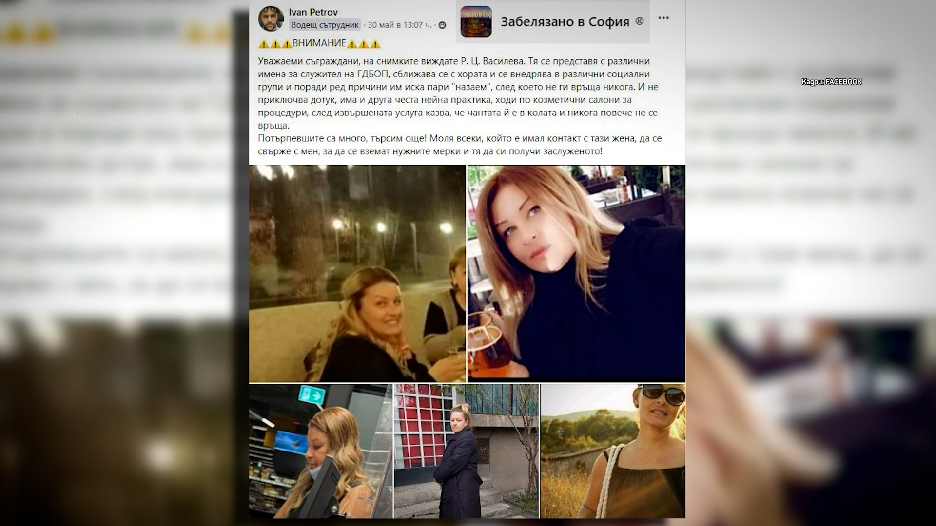 Хората, които ви демонстрираме във видеото твърдят, че са излъгани съвсем по еднакъв метод. Свързва ги това, че всички те са дали пари на жена, която се показва за антимафиот от ГБОП, а в действителност е някогашен дълготраен чиновник на Агенция „ Митници “. Представя се с разнообразни имена, само че същинското и име е Ралица Василева. Преди няколко дни мъж, който твърди, че е пострадал разгласява този пост със фотоси в една от обществените мрежи.