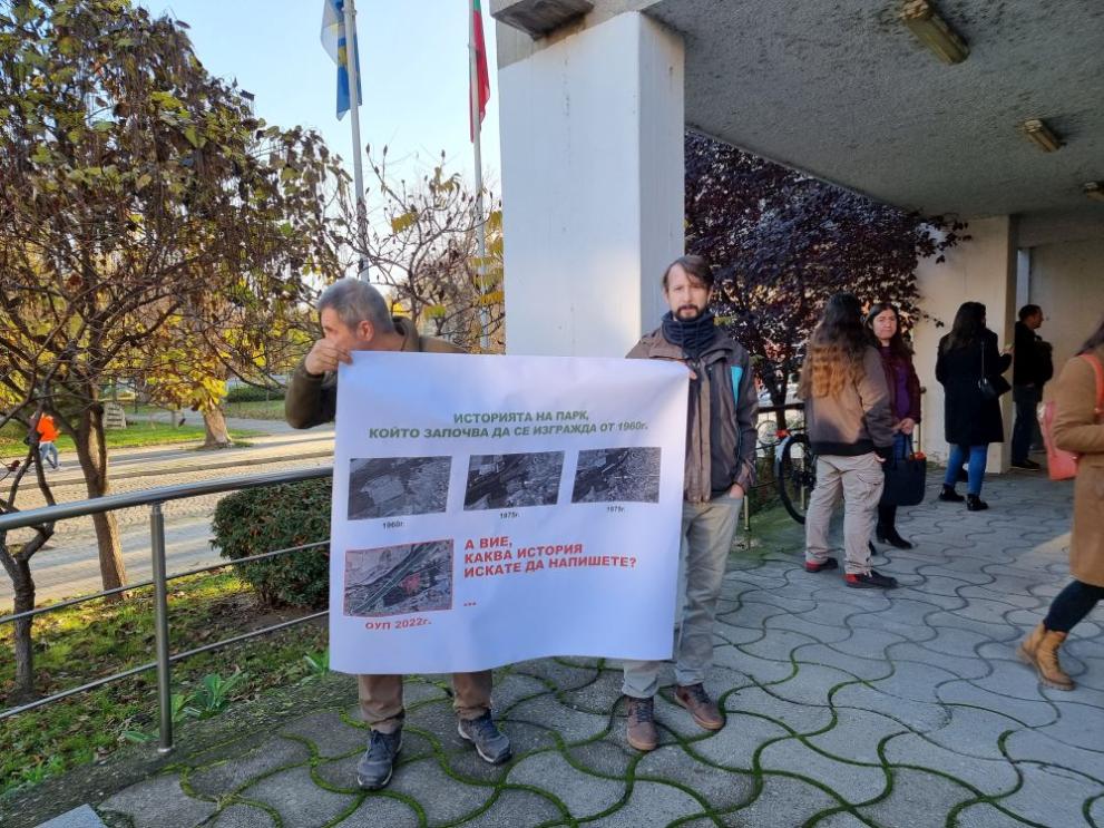 Хората държат плакати с надписи " Пловдив не предавайте града ни ", " Пловдив е на хората, не на мутри ", " Да спасим зеленото сърце на парка ". Протестиращите упорстват устройственият проект да бъде модифициран и паркът да се резервира.