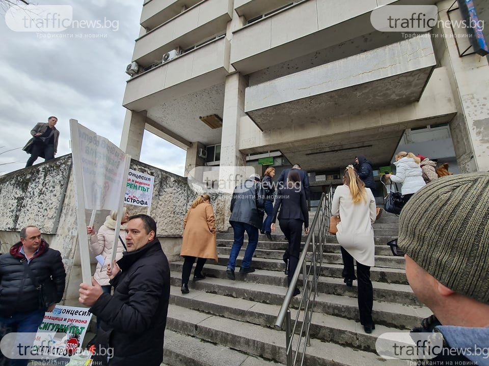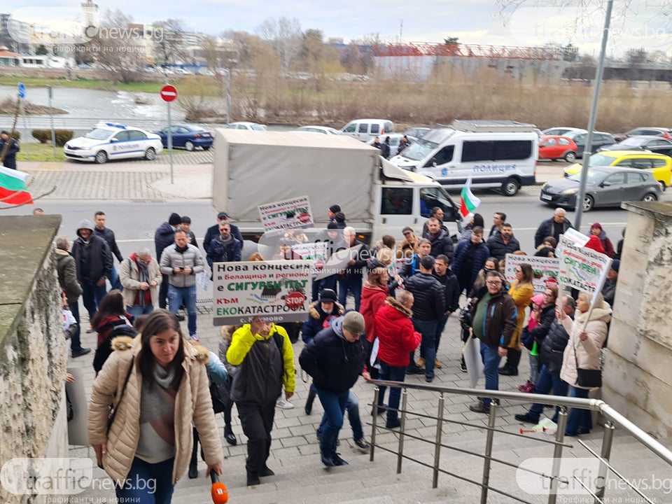 На място дойде и регионалният управителна на Пловдив Йордан Иванов, който заяви че тази заран е разговарял с шефа на Басейнова дирекция, с който са се разбрали регионът да бъде включен към санитарно- охранителна зона, поради съществуващите водоизточници, което на процедура ще направи невероятно удължаването на концесиите. " Очакваме през днешния ден становещето на Басейнова дирекция да бъде изпратено в Регионална инспекция за опазване на околната среда, което ще бъде мотив да бъде спряна процедурата по УВОС. Иванов дружно с няколко представители на протестиращите се качиха в постройката на Регионална инспекция за опазване на околната среда, с цел да беседват с шефа.