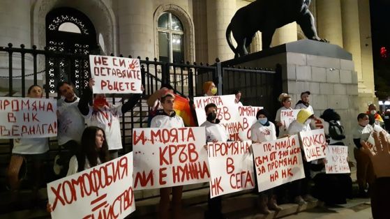 Десетки се стекоха на кротичък митинг под надпис " Не на омразата " пред Съдебната палата в София поради нападението на център на ЛГБТИ в събота. Имаше и засилено полицейско наличие в региона. Демонстрантите издигнаха раздрани тениски и плакати, на които пишеше " И моята кръв ли е нужна ", " Промяна в Наказателен кодекс незабавно " и " Аман! ".