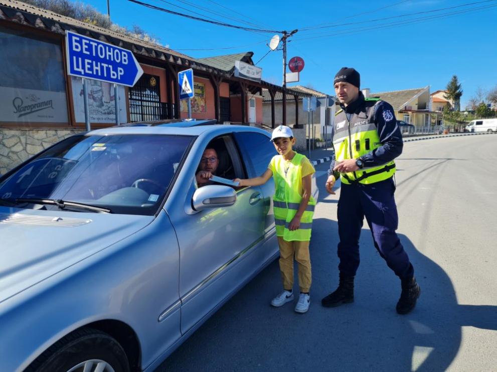 На водачите на спрените за инспекция моторни транспортни средства, станали участници в тяхното занимание, учениците предоставиха направени от тях брошури с обръщение „ Да пазим детето на пътя “.
