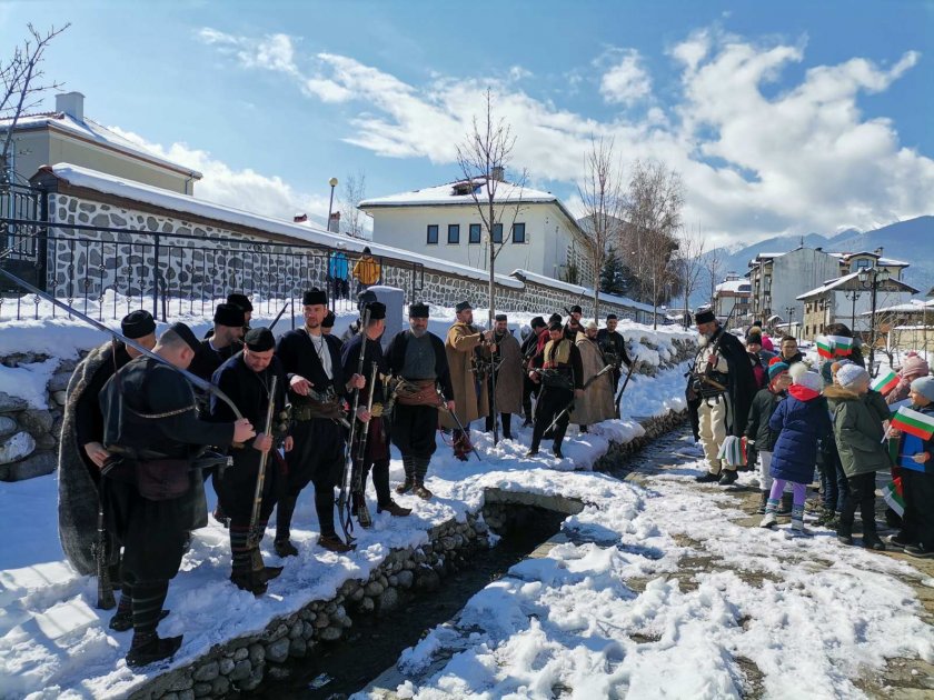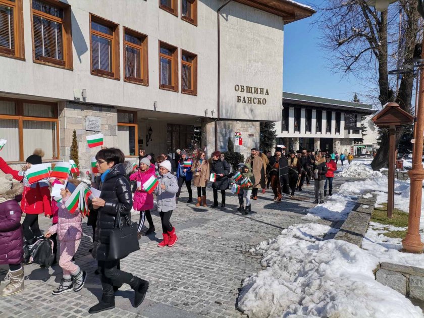 Деца от учебните заведения в Банско и членове на Национално хайдушко придвижване раздадоха над 200 български флагове и десетки картички на поданици и посетители на курорта в деня на Националния ни празник 3 март.