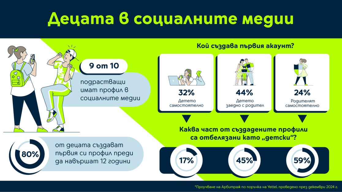 Децата стават дейни консуматори на интернет и обществените медии все по-рано, демонстрира новото изследване на Yettel „ Дигиталният живот на децата и техните родители “ . Данните сочат, че 9 от 10 подрастващи (до 19 години) имат профил в обществените медии, като 75% го основават преди да навършат 12 години, а 5% - под 7-годишна възраст. Ежегодното допитване на телекома е извършено от организация за пазарни изследвания „ Арбитраж “ в края на 2024 година измежду деца (7-12 г.), младежи (13-19 г.) и техните родители. То демонстрира трендовете при потреблението на интернет измежду подрастващите, най-честите закани и рискове, против които се изправят, и какъв надзор реализират родителите, с цел да ги защитят.