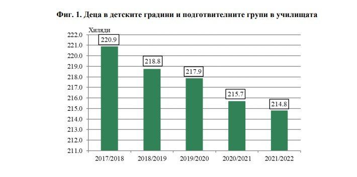 През 2021/2022 година в 1817-те ни независими градини и в учебните заведения с подготвителни групи са записани 214.8 хиляди деца, 110.5 хиляди (51.4%) от които са момчета. В съпоставяне с предходната година броят на децата понижава с 0.4%. Тогава броят им е бил 215.7, а през 1997/1998 година са били 220.9 хиляди