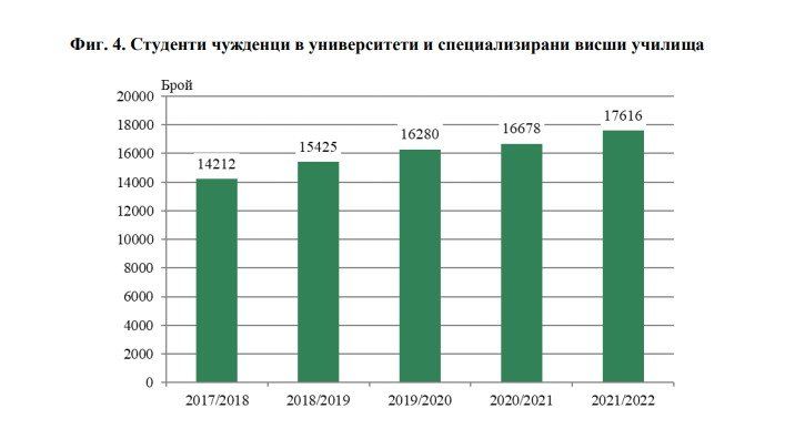 Най-много са непознатите студенти от Гърция - 24.1%, Обединеното кралство - 15.0%, Германия - 9.5%, Украйна - 6.7%, и Република Северна Македония - 5.6% от общия брой задгранични студенти. Повечето от тях избират да учат у нас специалности най-вече в региона на опазването на здравето (61.0%). 47.6% от всички учат медицина.