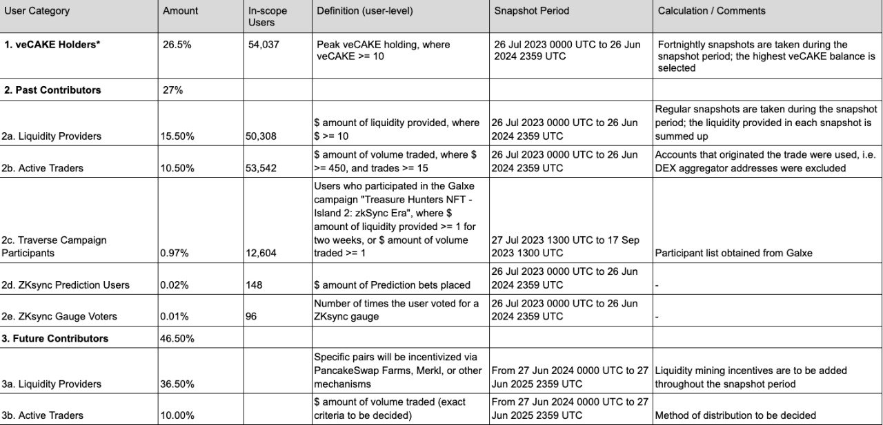 Право на присъединяване в airdrop събитието имат притежателите на veCAKE, доставчиците на ликвидност, дейните трейдъри, участниците в акцията Traverse, прогнозиращите консуматори и гласуващите за Gauge.