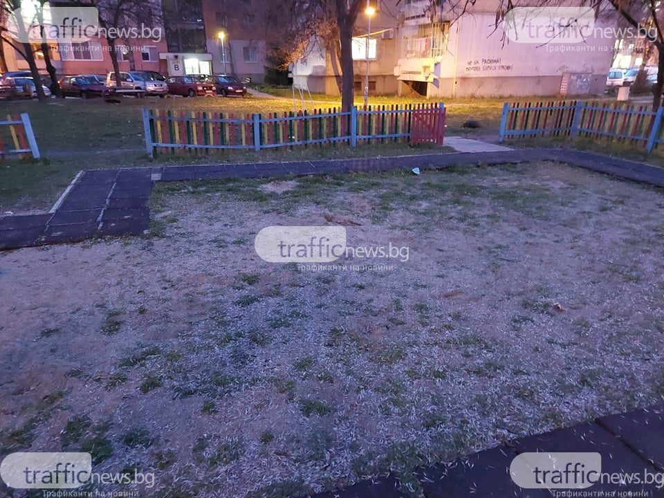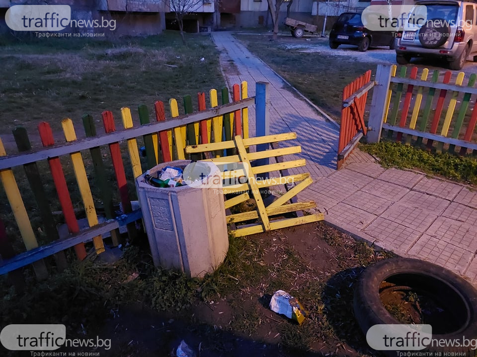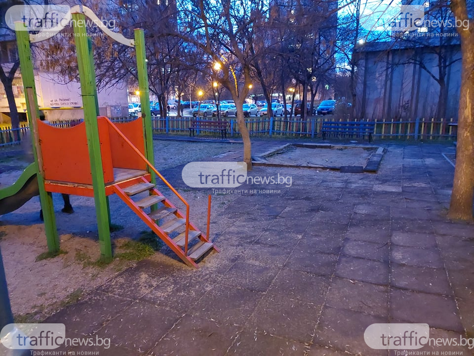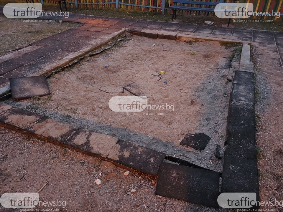 Изпочупени шарените огради лежат пръснати из площадката, а от люлките вид везна е останало единствено ръждива железна структура. Пясъчникът наподобява повече на котешка тоалетна, цялостна с отпадъци. Седалките към него са откъртени, а по странни условия в огражденията има и автомобилна гума.