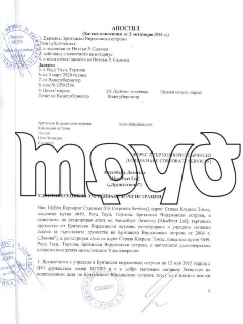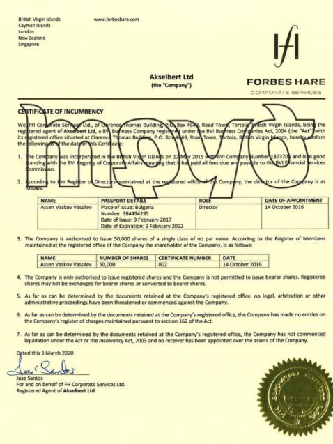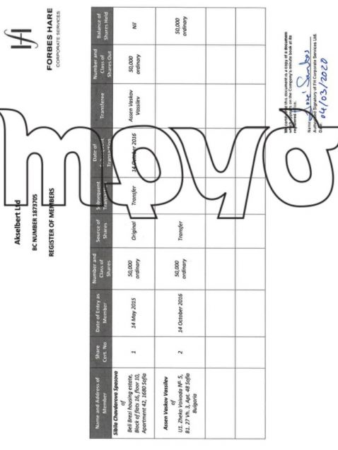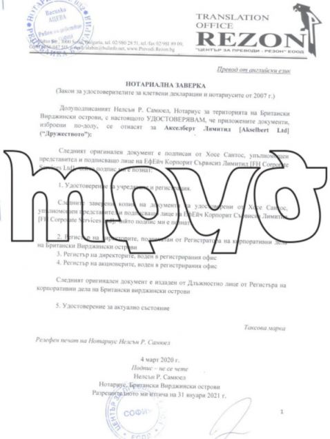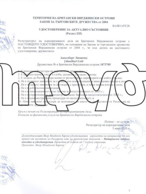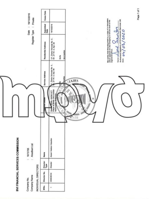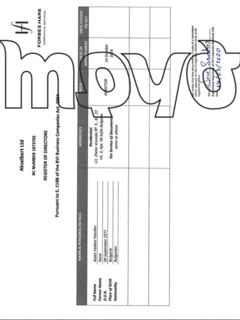 Въпреки това от комерсиалния указател се вижда че компанията, която е била благосъстоятелност на Асен Василев през 2020 година е отчела единствено 5 хиляди лева облага и ще заплати единствено 500 лева налог при милионни доходи. Но преминавайки през компанията в Англия и връщайки се към записаната на Британски Вирджински острови офшорка Акселберт Лимитед още веднъж се вижда, че нейните активи в България остават със скрита активност.