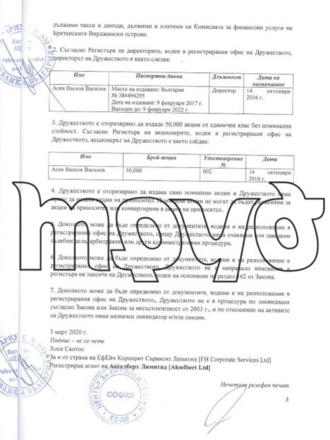 Асен Василев има целия капитал от 50 000 акции. ДАНС, Национална агенция за приходите и КПКОНПИ към този момент започнаха инспекции на политици, притежатели на офшорни компании, само че се оказва че шефът на Национална агенция за приходите, за който е ясно, че е получил ревизионния си отчет за дължими над 1.2 млн. лева за компанията Гранекс Трейдър преди да я продаде, в този момент ще би трябвало да ревизира някогашния си шеф, който дълго прикриваше дейностите му. Офшорката Акселберт Лимитед от своя страна има в България няколко сдружения, които все още в българския указател стоят вписани с краен притежател Асен Василев. Това са “СТВ България” ЕООД и “СТВ Холдингс” ЕООД. До назначението си за длъжностен министър на финансите Асен Василев е бил директен притежател, без присъединяване на офшорката, и на българската “СТВ Консълтинг” ЕООД, чието изписване на латиница в комерсиалния указател е CTW CONSULTING.