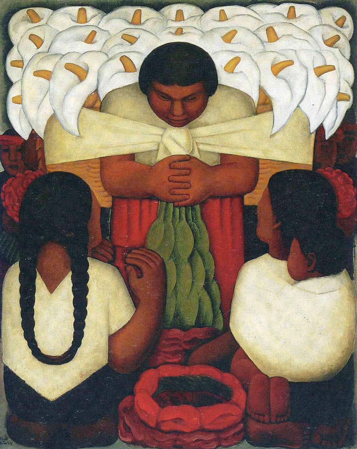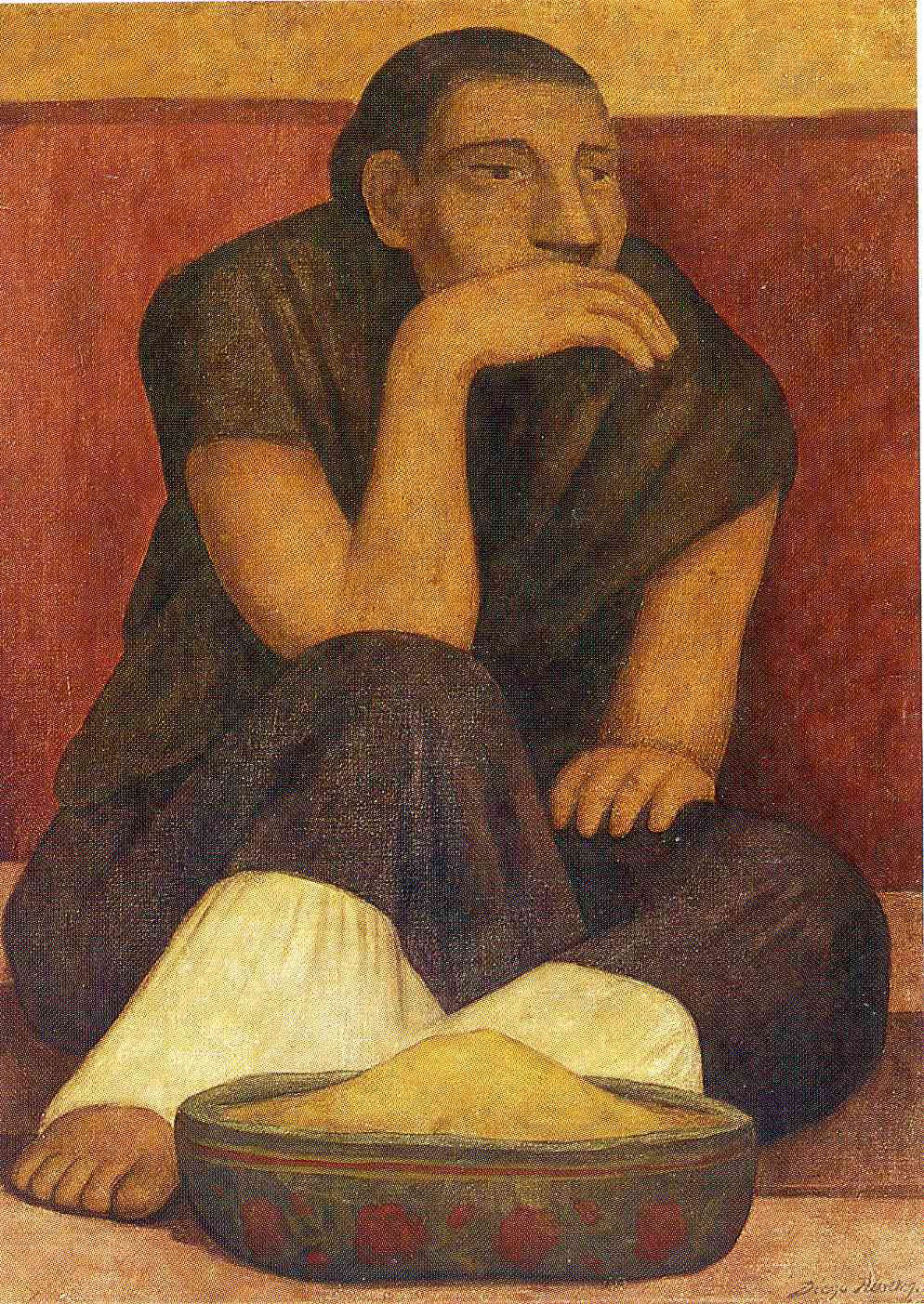 НЕГОВАТА ФОРМА: Диего е огромно, голямо дете си благо лице и малко печален взор, с глава на азиатец, на която пораства тъмна коса, толкоз тънка и фина, че наподобява като че ли се рее във въздуха. Неговите изпъкнали, тъмни, доста интелигентни и огромни очи едвам се удържат в орбитите от подути и издадени клепачи. Те наподобяват очите на земноводно, по-раздалечени от нормално. Затова и погледът му може да обхване доста по-широко зрително поле, като че ли очите му са основани особено за художник на огромни пространства и групи. Между очите му, толкоз отдалечени едно от друго, човек може да долови невидимата източна мъдрост, а ироничната и сладка усмивка, цветът на неговия облик, доста рядко изчезва от устата му с дебели устни като на Буда. Когато го видиш гол, незабавно се сещаш за малко жабче, застанало на задните си крайници.
