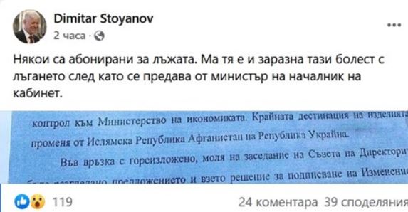 „ Публикувал е няколко реда текст и внушава, че се изнася оръжие от Афганистан за Украйна. Но не е обърнал внимание, че в документа написа „ Министерство на стопанската система “. Т.е., документът е от служебния кабинет на Радев. Защото министерството, което Нинова оглавява, се преименува на „ Министерство на стопанската система и промишлеността “, отбелязва той.