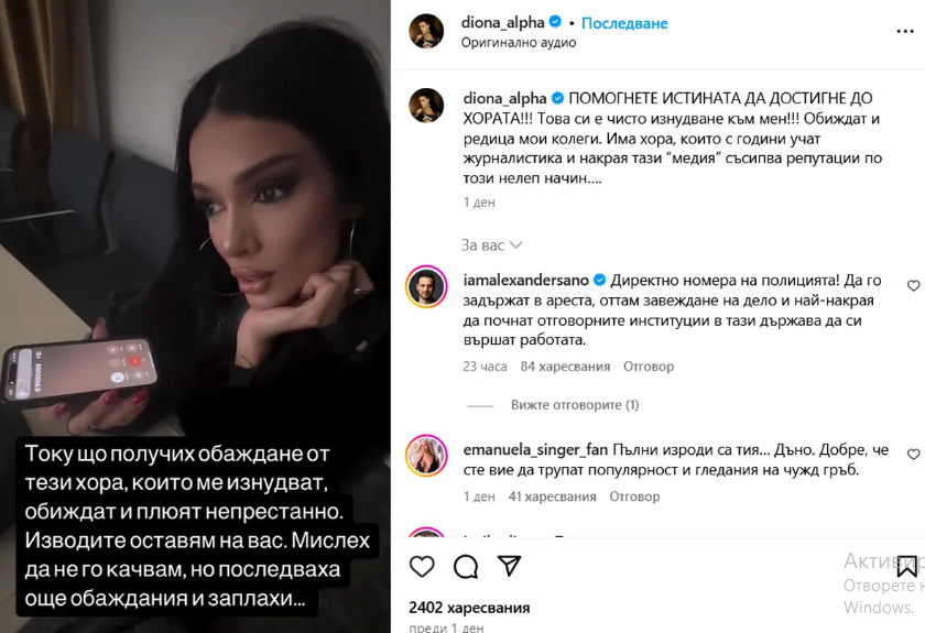 Диона приканва още: “ПОМОГНЕТЕ ИСТИНАТА ДА ДОСТИГНЕ ДО ХОРАТА!!! Това си е чисто изнудване към мен!!! Обиждат и редица мои сътрудници. Има хора, които с години учат публицистика и най-после тази “медия ” унищожава репутации по този безразсъден начин… ”
