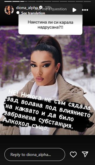 Преди броени часове Диона още веднъж влезе в пояснителен режим, като разреши на почитателите ѝ да ѝ задават въпроси, на които тя отговори в стори. И напълно предстоящо още първият въпрос беше обвързван със случая: " Наистина ли си карала надрусана? ". Диона е безапелационна, че в никакъв случай не е сядала зад кормилото под въздействието на неразрешени вещества, в това число и алкохол.