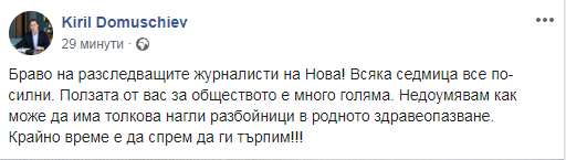 „ Браво на проверяващите публицисти на NOVA! Всяка седмица все по-силни. Ползата от вас за обществото е доста огромна. Недоумявам по какъв начин може да има толкоз нагли разбойници в родното опазване на здравето. Крайно време е да спрем да ги поносим!!! ”. Така притежателят на „ Адванс Медия Груп " Кирил Домусчиев разяснява следствията на NOVA за нарушавания в пазарджишката болница.