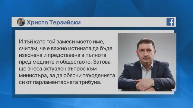Терзийски укори служебният министър, че отклонява публичното внимание от проблемите в активността на Министерство на вътрешните работи: „ И защото той замеси моето име, смятам, че е значимо истината да бъде изяснена и показана в цялост пред медиите и обществото. Затова ще внеса настоящ въпрос към министъра, с цел да изясни изказванията си от парламентарната естрада “.