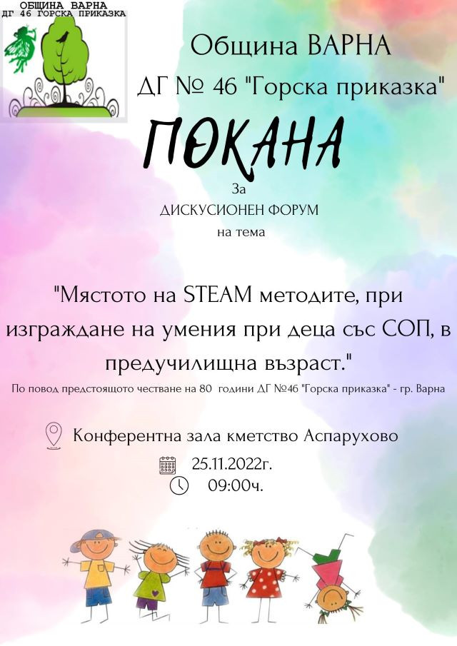 Дискусионен конгрес на тематика: „ Мястото на STEAM методите, при създаване на умения при деца със специфични просветителни потребности (СОП) в предучилищна възраст “ ще се организира на 25 ноември /петък/ от 9:00 ч. в конферентната зала в административната постройка на Район „ Аспарухово “. Срещата е инициирана от екипа на ДГ № 46 „ Горска приказка “ – гр. Варна. Поканени са детски градини със специфични групи и такива с обичаи при образуване на профилирано образование и даване на спомагателна поддръжка на деца с просветителни усложнения.