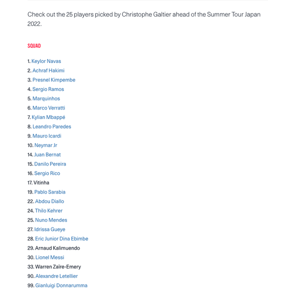 Тимът потегля на турне с 25 играчи, измежду които са спряганите за овакантяване Неймар, Преснел Кимпембе, Мауро Икарди и други