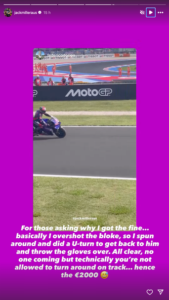 Причината за санкцията на австралиеца е неговото придвижване с посока противоположна на посоката на придвижване на пистата след финала на надпреварата. Пилотът на Прамак Ямаха изясни в своя профил в Инстаграм, че е направил това, тъй като е подминал почитател, който му е заречен да го почерпи бира, в случай че Милър му даде своите ръкавици.