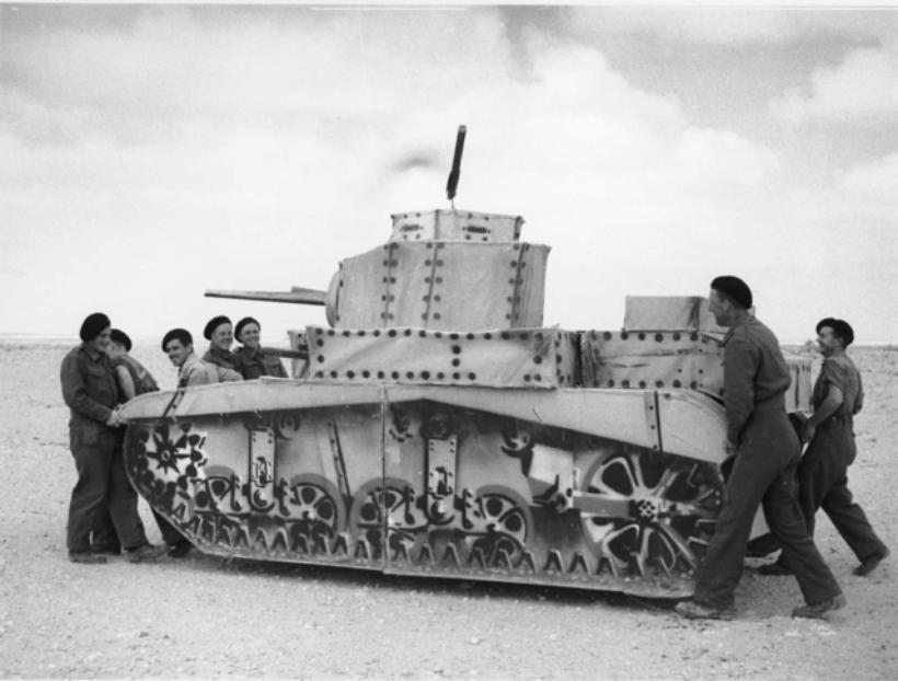 Скритата войска от Ел-Аламейн Сред най-големите документирани достижения на английския пробен камуфлаж е интервенция с кодовото име „ Операция Бертрам ”, която спомага за успеха във втората борбата при Аламейн през 1942 година, която дефинитивно обръща хода на Северноафриканската акция в интерес на Съюзниците. Стратегията била посредством редица лъжливи маневри немските военни сили в Африка (по това време под командването на Ервин Ромел) да бъдат заблудени, че противниковата офанзива ще пристигна от юг, а не от север. В книгата Фантомната войска от Аламейн (2012) Рик Страуд блестящо разказва приноса за успеха на изобретателен екип с присъединяване на Джаспър Маскелин и други известни за времето си актьори и под командването на някогашния кино режисьор майор Джефри Баркас. Екипът основава подправена войска от бутафорни танкове на южния фронт, до момента в който същинските танкове и оръжия на север са прикрити под структури от картон и платнище по този начин, че да наподобяват като елементарни камиони. Част от „ реквизита ” е и неестествен газопровод, който екипът построява, с цел да заблуди врага, както за посоката на офанзивата, по този начин и за датата. Успокоен, че прокарването на газопровода евентуално ще отнеме най-малко няколко седмици, Ромел разчита, че има задоволително време и се оказва неопитен, когато британците атакуват.