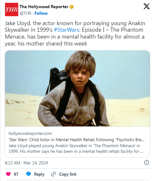 Джейк Лойд, артистът, прочут с ролята си на младия Анакин Скайуокър в " Междузвездни войни: Епизод I – Невидима опасност " от 1999 година, е в психиатрична клиника от близо година. Това показа майка му за Scripps News.