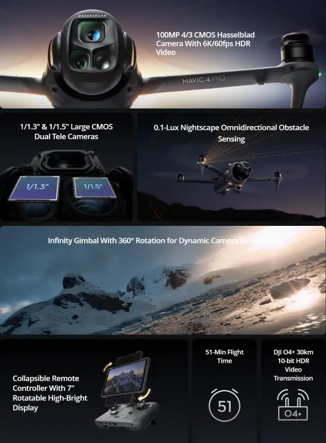 DJI Mavic 4 Pro публично се появи на пазара, като се отличава с усъвършенствания спрямо предшественика си, най-много с неповторимия 360° Infinity Gimbal. Този новаторски гимбал разрешава цялостно завъртане на 360 градуса, което дава опция за снимане на всевъзможни ъгли и отвесно видео, и може да се накланя нагоре със 70° за още по-драматични вероятности.
