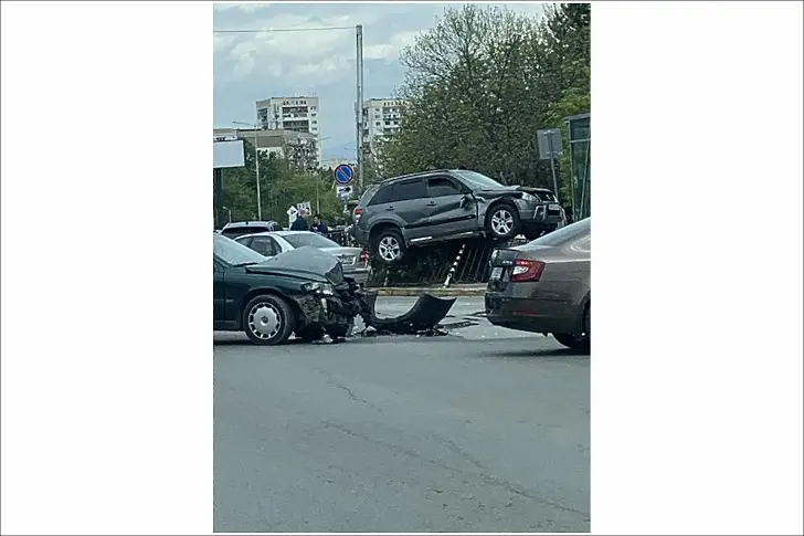 Джип се качи върху оградата на метростанция в София, след удар с друг автомобил