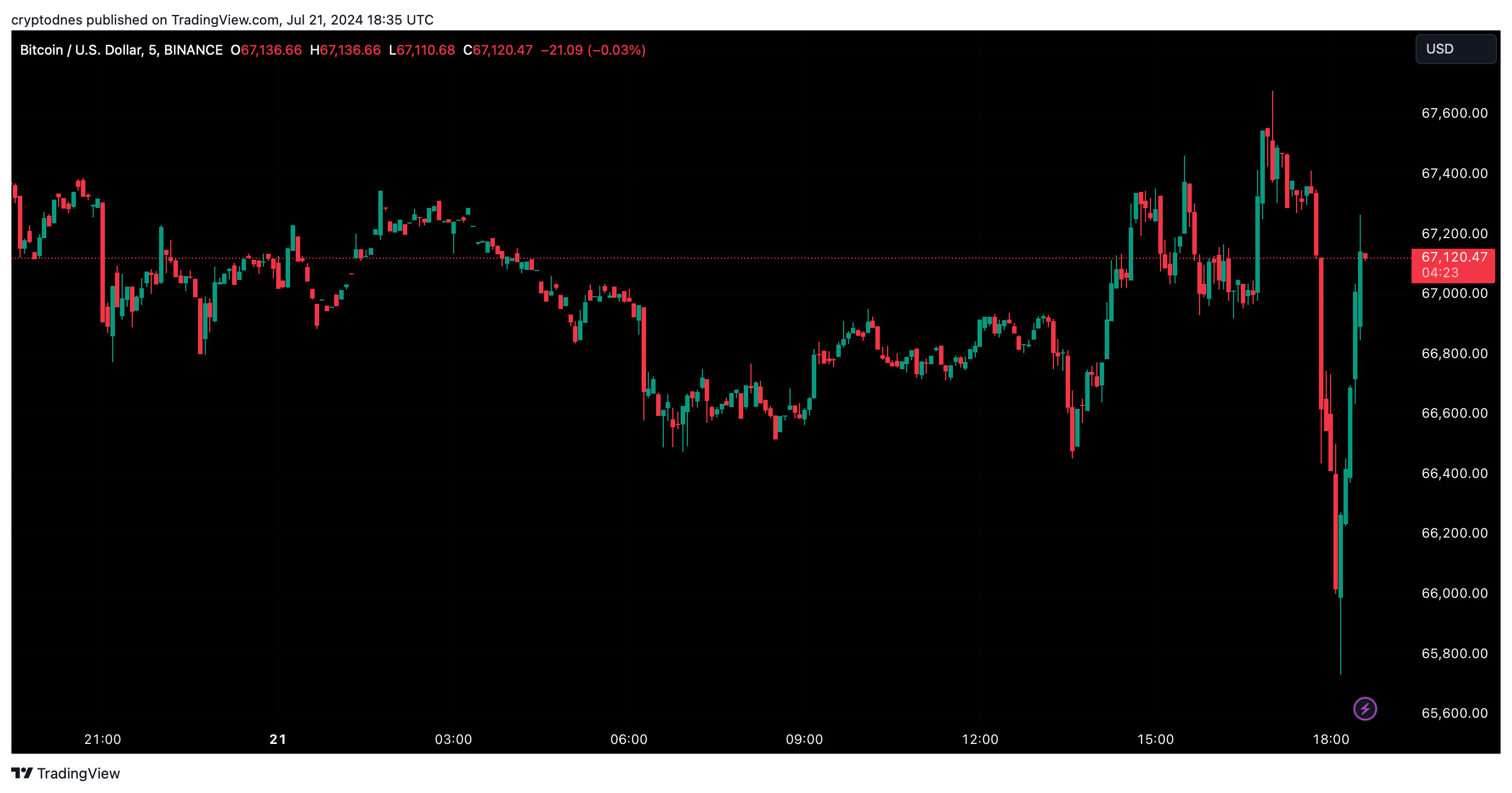 Въпреки този спад от 2% през последния час, водещата криптовалута се възвърне на равнище над $67,000 все още на писане на публикацията с размер на търговията от $20.8 милиарда.