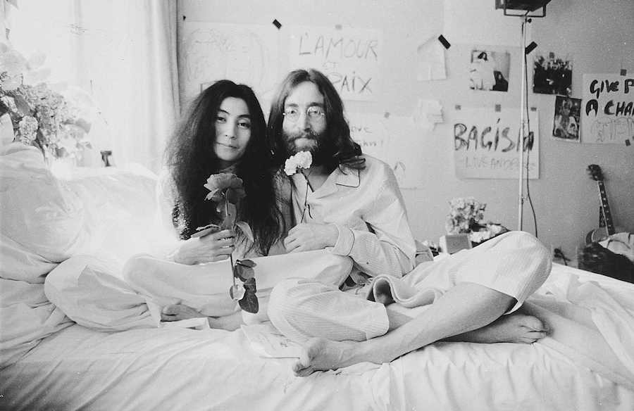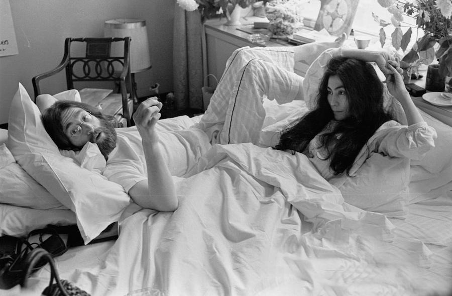 (John Lennon and Yoko Ono at the first day of their Bed-In for Peace in the Amsterdam Hilton Hotel, 1969)