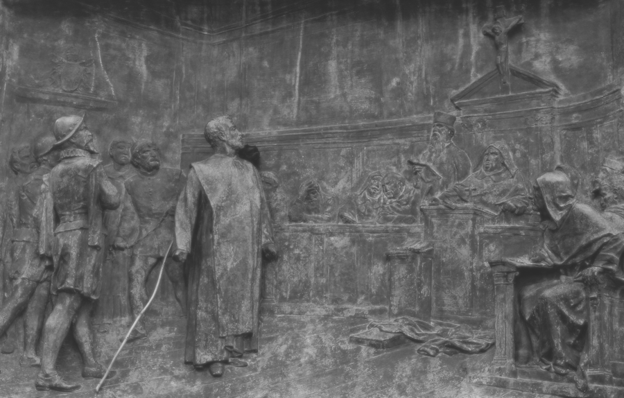 (The trial of Giordano Bruno by the Roman Inquisition. Bronze relief by Ettore Ferrari, Campo de' Fiori, Rome)