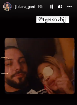 Гани театралничи гушната с настоящия си обичан Теодор, само че е с марля на едното си око. Последователите й се запитаха какво се е случило с окото на любимката им, само че тя сподели, че ще издаде по-късно какво си е правила на лицето.