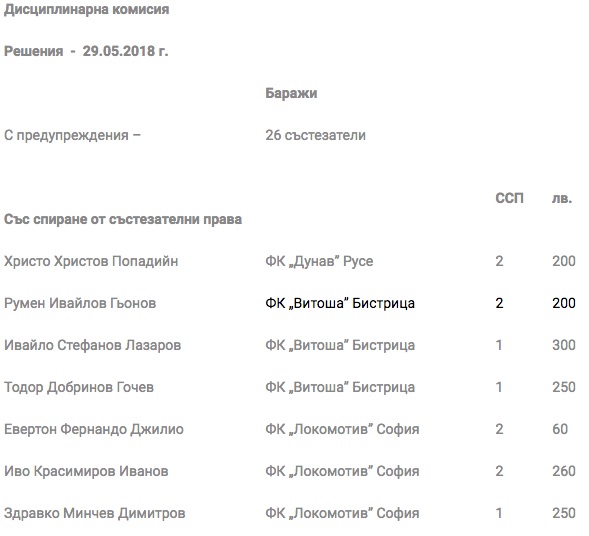 ДК към БФС санкции Локомотив (София) с 3575 лв. след баража за влизане/оставане в Първа лига против Витоша (Бистрица). Финансова глоба отнесе и Левски за прегрешения по време на баража за Лига Европа против Черно море.