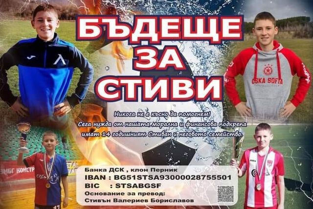 Днес (18 февруари) град Перник прегръща благородната идея да избави един от футболните гении на града. 14-годишният Стивън Бориславов има потребност от скъпо лекуване, откакто беше диагностициран със сарком на Юинг.