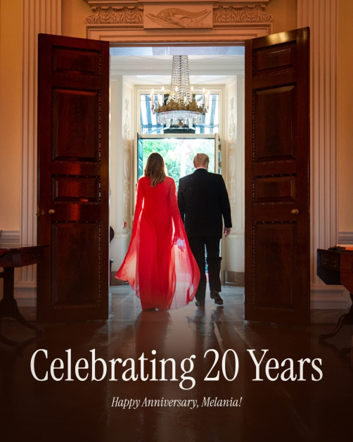 “Празнувам 20 години с красивата си брачна половинка и нашата невероятна първа дама, Мелания. Ти си изключителна брачна половинка и прелестна майка. Честита годишнина, Първа Дама Мелания Тръмп! ”