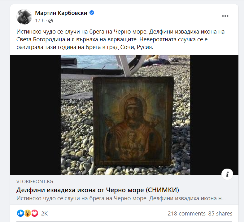 " Истинско знамение се случи на брега на Черно море. Делфини извадиха икона на Света Богородица и я върнаха на вярващите. Невероятната преживелица се е разиграла тази година на брега в град Сочи, Русия ". Тази невероятна вест популяризира малко след нахлуването на Путин в украйна журналистът Мартин Карбовски.