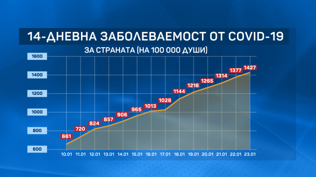 Общата заболеваемост за страната се покачва до 1427 на 100 000 по отношение на 1377 през вчерашния ден.