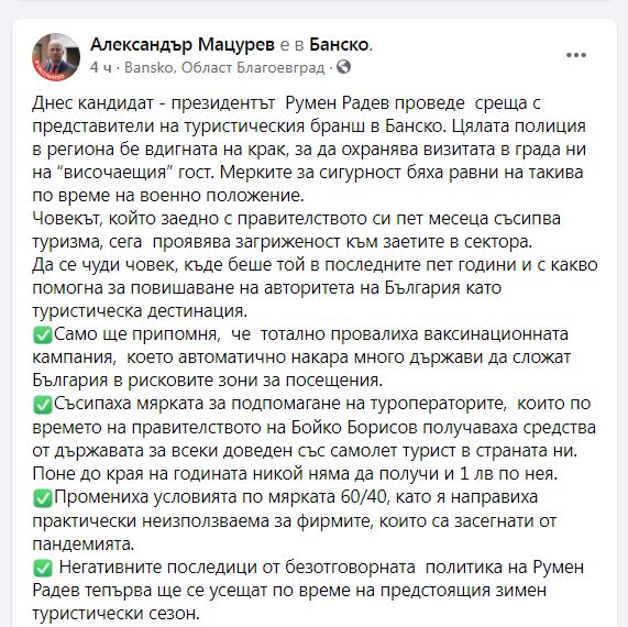 Днес кандидат-президентът Румен организира среща с представители на туристическия отрасъл в Банско. Цялата полиция в района бе вдигната на крайник, с цел да охранява визитата в града ни на “височайшия” посетител. Мерките за сигурност бяха равни на такива по време на военно състояние. Това написа на страницата си във Facebook някогашният народен представител от ГЕРБ и някогашен зам.-кмет на Александър Мацурев.