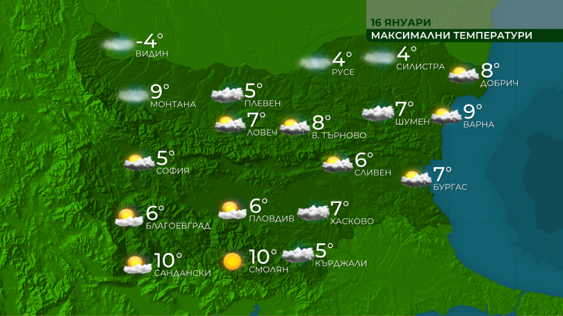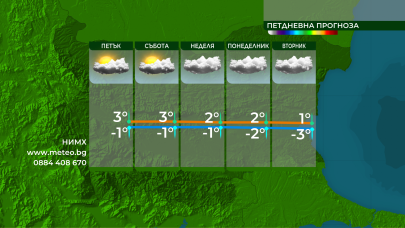 Дневните температури в регионите с трайна мъгла ще са по-ниски, сред 2° и 7°, а в планинските региони, където ще бъде най-вече слънчево - до 10-11°. В София – към 5°, а по Черноморието – към 7° до 9°.