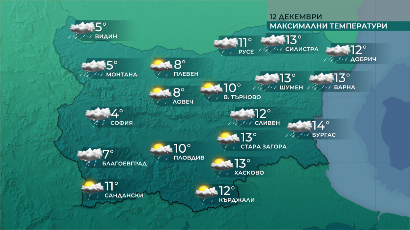 Ще бъде най-вече облачно, тук-там към момента с валежи от дъжд. Вятърът ще се ориентира от северозапад, най-късно в Източна България. С него ще прониква по-студен въздух и вечерта в Западния Предбалкан и котловинните полета в западните региони ще стартира да превалява сняг.