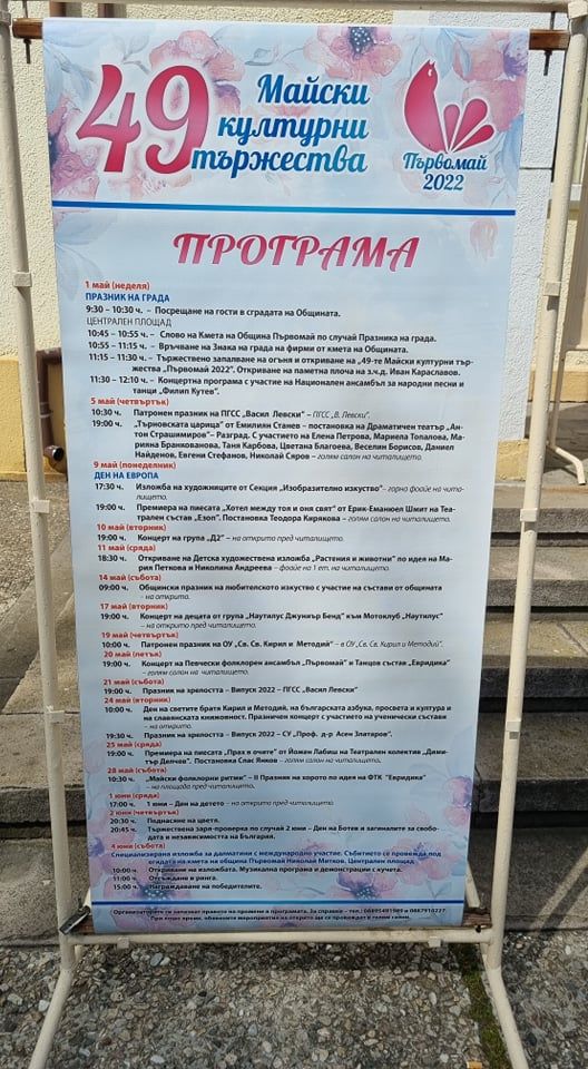 - Изклъчително празнично и тържествено. Тази година трябваше да са 50-ти юбилейни културни празненства, само че ще са 49-ти майски културни празненства, които хората чакат с неспокойствие. Ще има театри, концерти в културната стратегия, избожби. Надявам се първомайци да бъдат привлечени от културните събития и месец май да бъде един пъстър с изкуство месец.