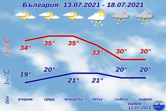 Днес над България ще бъде слънчево. След обяд ще има краткотрайни нараствания на облачността и на обособени места в планинските региони ще превали кратковременно. Ще духа до сдържан вятър от изток-североизток. Максималните температури ще са сред 31° и 36°. В София - към 31°, предвижда Национален институт по метеорология и хидрология.