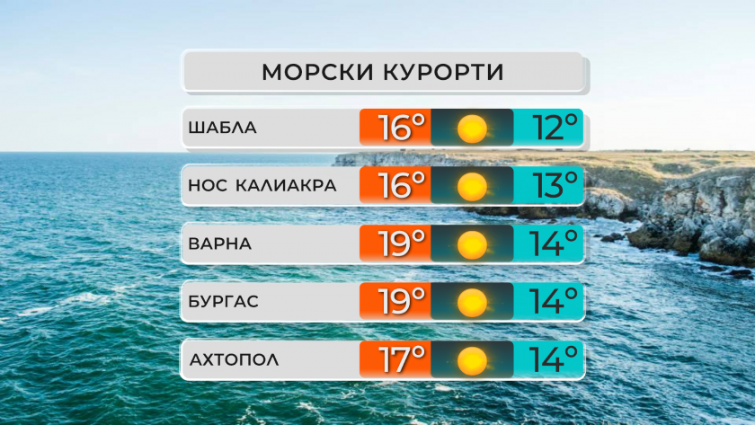 Над Черноморието ще доминира слънчево време. Ще духа до сдържан североизточен вятър. Максималните температури ще са 14°-19°. Температурата на морската вода е 12°-14°. Вълнението на морето ще бъде 2-3 бала.